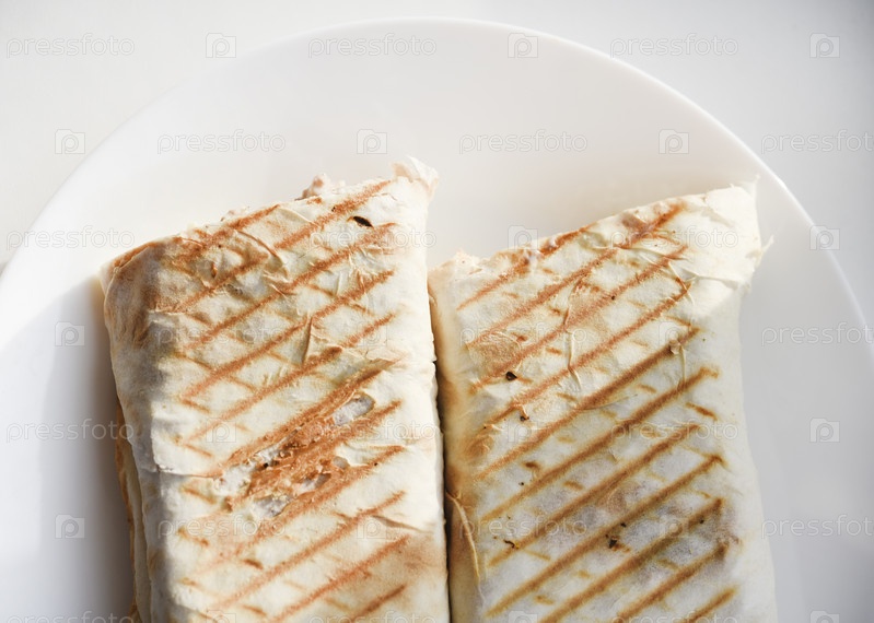 Мясная шаурма на белой тарелке. Мясной деликатес. Гирос-кебаб