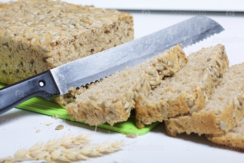 Выпечка хлеба дома. На разделочной доске лежит буханка свежеиспеченного цельнозернового хлеба с семечками. Видны ломтики хлеба и нож