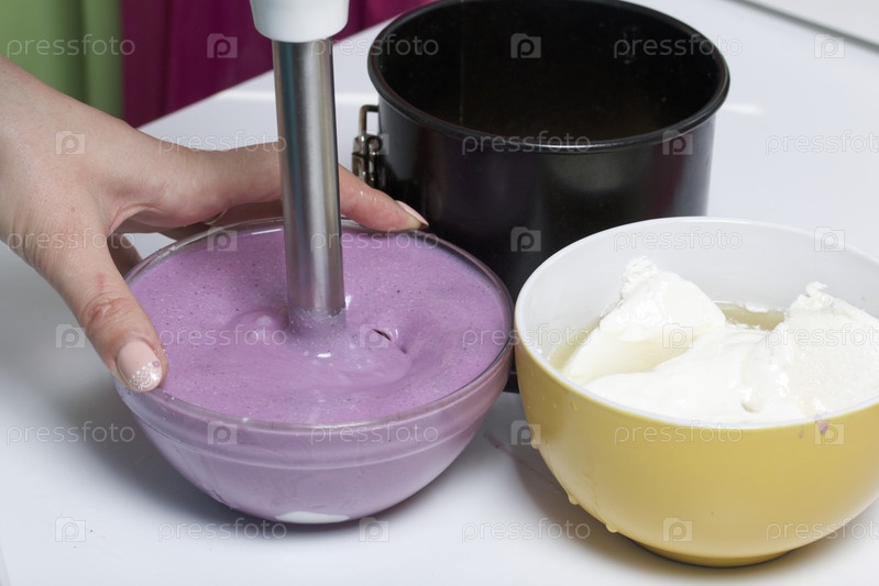 Черничный чизкейк. Женщина смешивает в блендере черничное варенье с творожным желе. Ингредиенты для приготовления расположены на поверхности стола