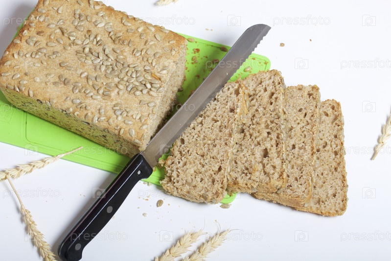 Выпечка хлеба дома. На разделочной доске лежит буханка свежеиспеченного цельнозернового хлеба с семечками. Видны ломтики хлеба и нож