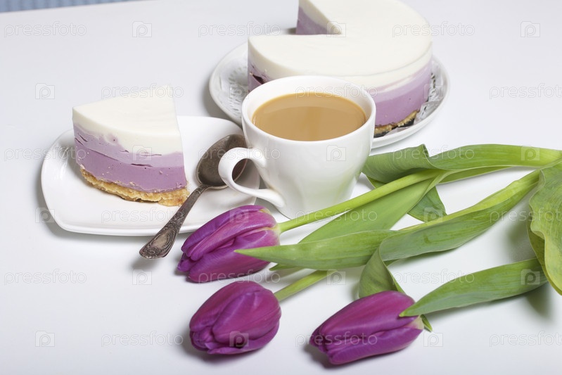 Черничный чизкейк. Кусочек готового десерта на блюдце. Видны желейные слои разного цвета. Рядом чашка кофе и букет тюльпанов