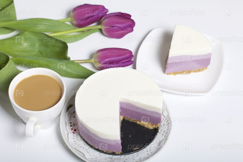 Черничный чизкейк. Кусочек готового десерта на блюдце. Видны желейные слои разного цвета. Рядом чашка кофе и букет тюльпанов