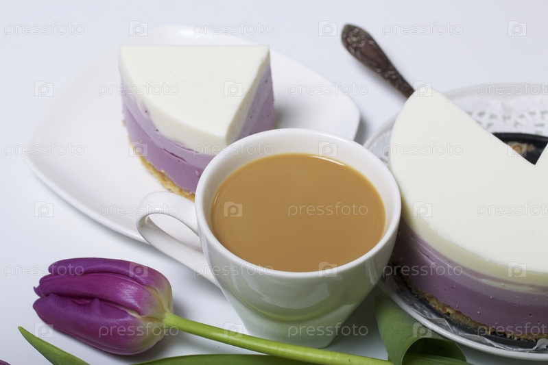 Черничный чизкейк. Кусочек готового десерта на блюдце. Видны желейные слои разного цвета. Рядом чашка кофе и букет тюльпанов