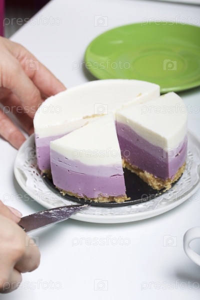 Черничный чизкейк. Женщина кладет на блюдце кусок готового десерта. Видны желейные слои разного цвета