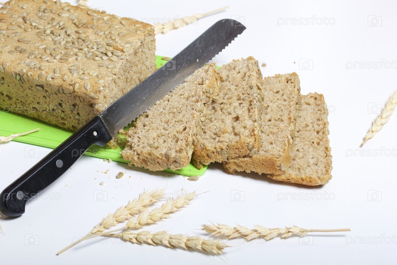 Выпечка хлеба дома. На разделочной доске лежит буханка свежеиспеченного цельнозернового хлеба с семечками. Видны ломтики хлеба и нож