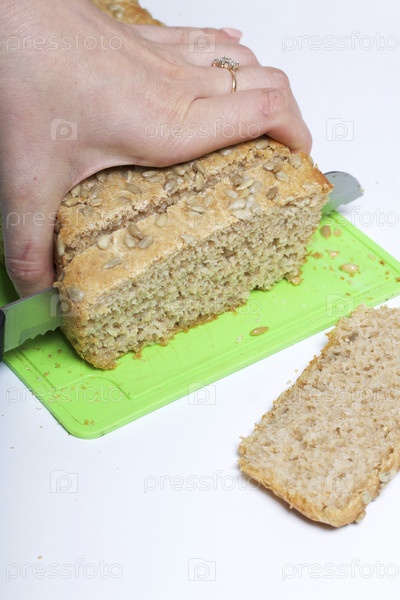 Выпечка хлеба дома. На разделочной доске лежит буханка свежеиспеченного цельнозернового хлеба с семечками. Женщина режет его ножом