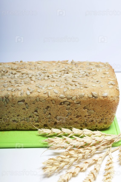 Выпечка хлеба дома. На разделочной доске лежит буханка свежеиспеченного цельнозернового хлеба с семечками. Рядом лежит колосок
