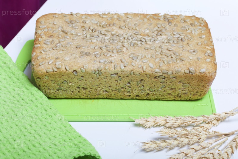 Выпечка хлеба дома. На разделочной доске лежит буханка свежеиспеченного цельнозернового хлеба с семечками. Рядом лежит полотенце и колоски