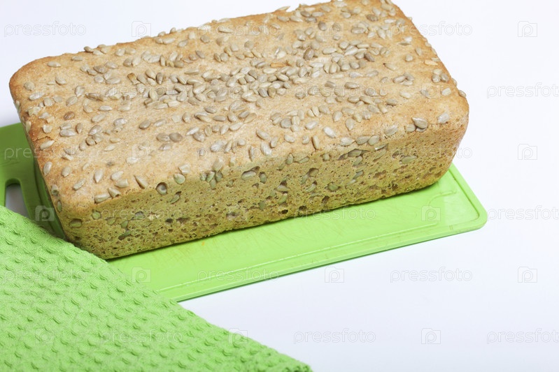 Выпечка хлеба дома. На разделочной доске лежит буханка свежеиспеченного цельнозернового хлеба с семечками. Рядом лежит полотенце