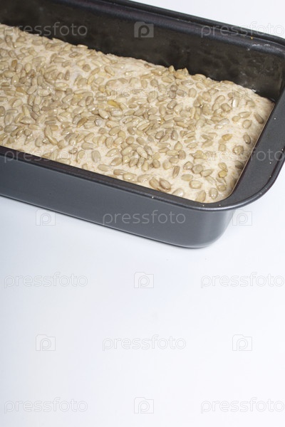 Выпечка хлеба дома. Цельнозерновое тесто лежит в форме для хлеба. По поверхности теста рассыпают семечки