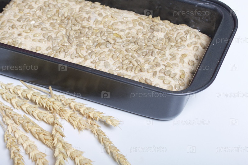 Выпечка хлеба дома. Цельнозерновое тесто лежит в форме для хлеба. По поверхности теста рассыпают семечки. Далее на поверхности стола располагаются колоски