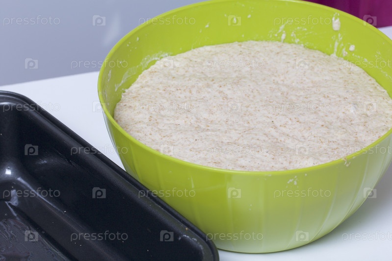 Выпечка хлеба дома. Цельнозерновое тесто лежит в контейнере. Рядом металлическая форма для выпечки хлеба