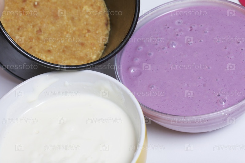 Черничный чизкейк. Бисквитная основа, творожное желе со сметаной и черничным джемом. Ингредиенты для приготовления расположены на поверхности стола