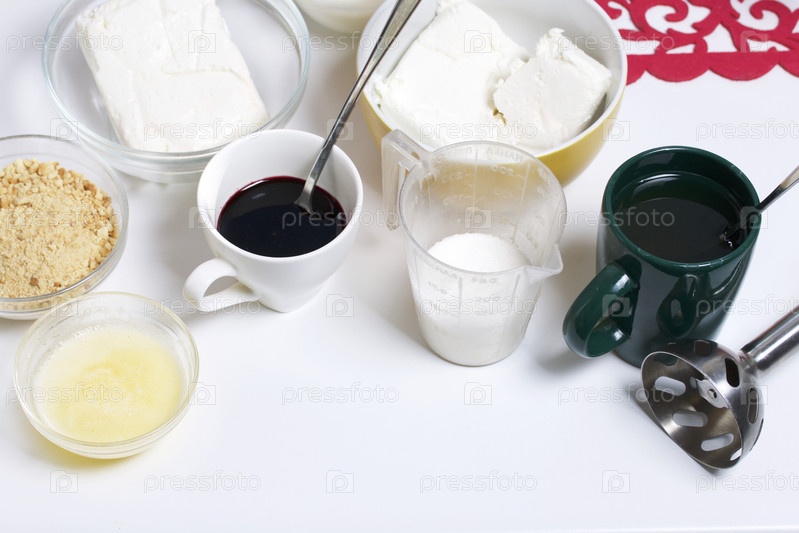 Черничный чизкейк. Ингредиенты для приготовления расположены на поверхности стола