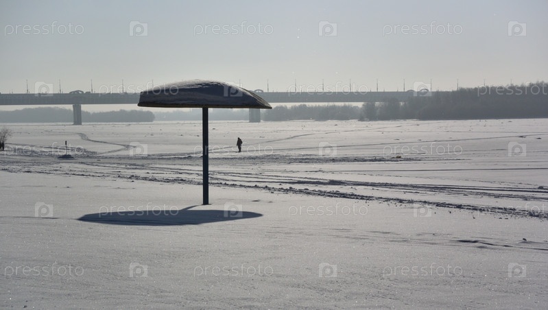 Вид на зимний пляж на берегу реки Иртыш