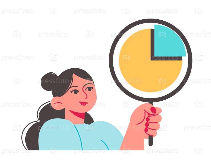 Анализирующая женщина с лупой смотрит на диаграмму