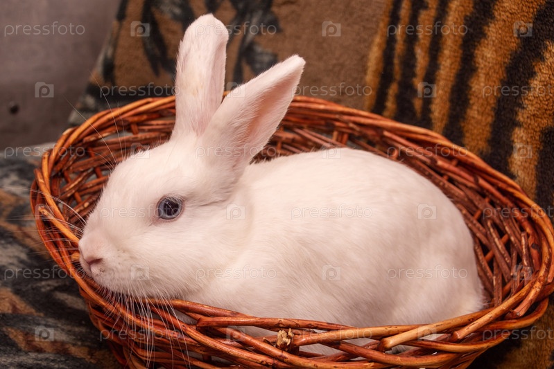 Красивый белый кролик сидит в корзине