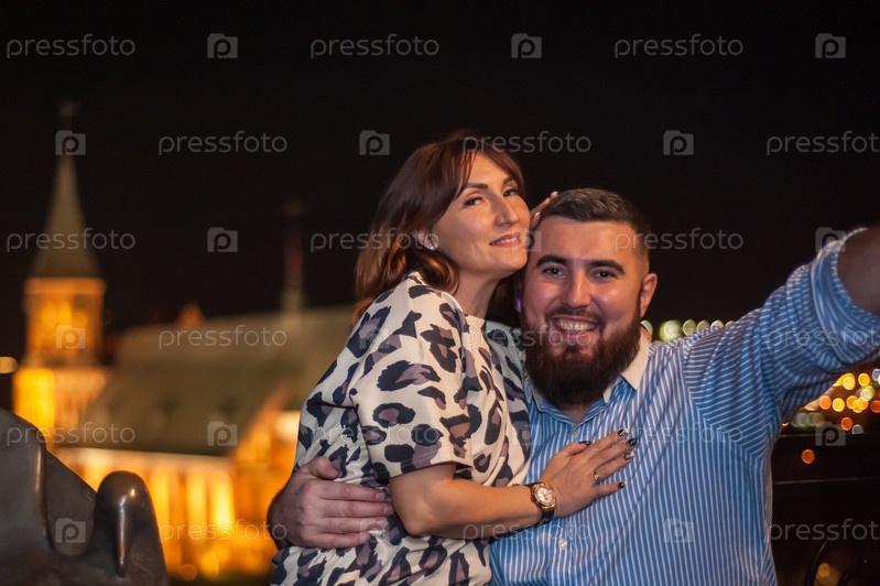 Молодые люди, мужчина и женщина на свидании ночью на фоне городских огней