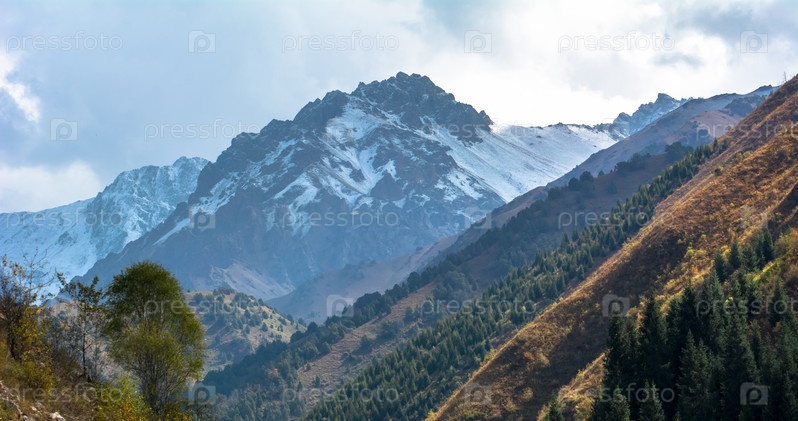 Горный лес и заснеженные горы в ущелье Чичкан Кыргызстан