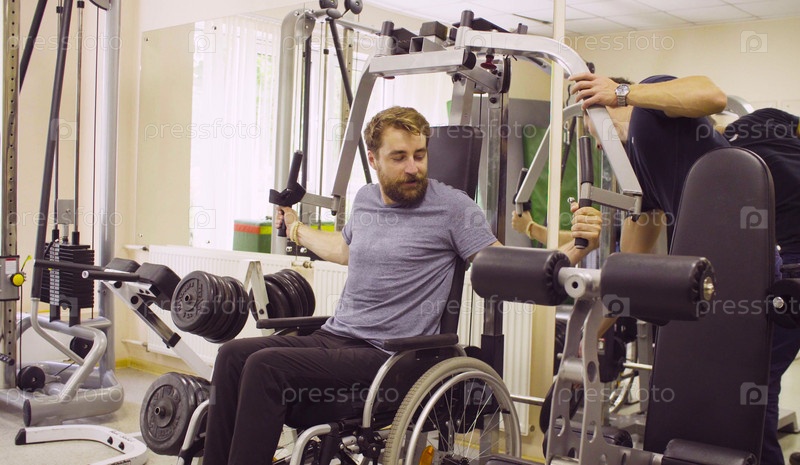 Инвалид в инвалидной коляске делает упражнения для рук