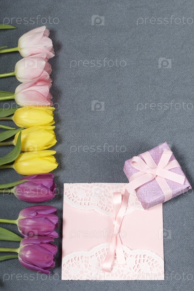 Желтые и розовые тюльпаны выстроились в ряд на сером фоне. Следующая открытка и подарочная упаковка