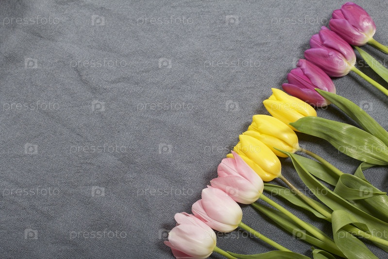 Желтые и розовые тюльпаны выстроились в ряд на сером фоне