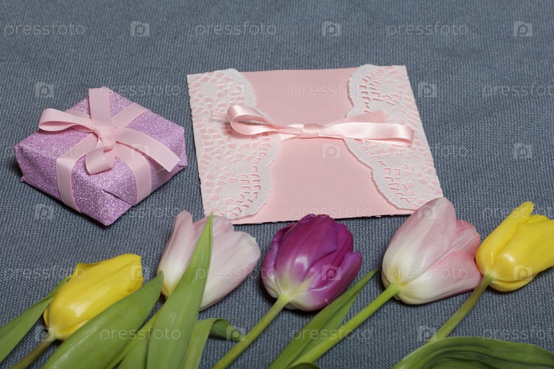 Букет тюльпанов разных цветов на сером фоне. Следующая открытка и подарочная упаковка