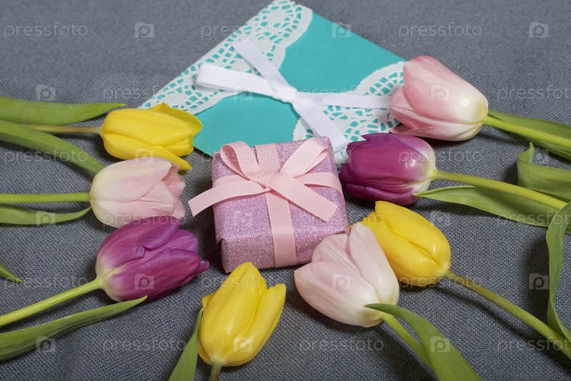 Букет тюльпанов разных цветов на сером фоне. Следующая открытка и подарочная упаковка