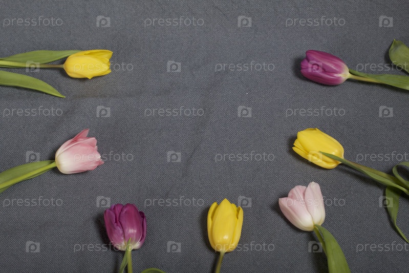 Букет тюльпанов разных цветов на сером фоне. На подкладке полукольцом