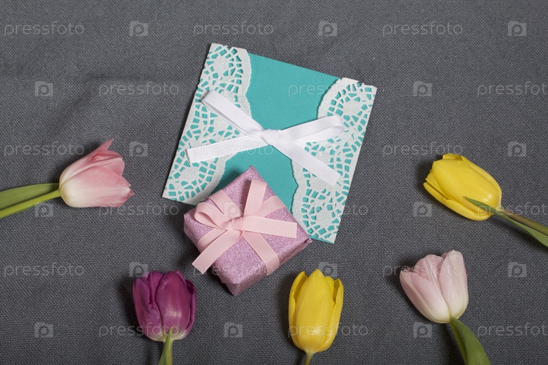 Букет тюльпанов разных цветов на сером фоне. Следующая открытка и подарочная упаковка