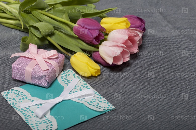 Букет тюльпанов разных цветов на сером фоне. Следующая открытка и подарочная упаковка