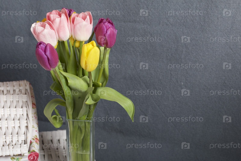 Букет тюльпанов разных цветов на сером фоне. Рядом плетеные ящики