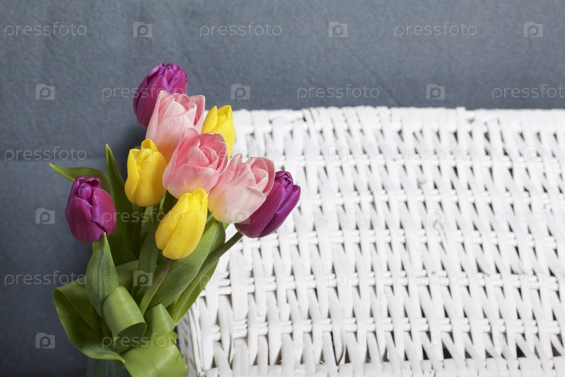 Букет тюльпанов разных цветов на сером фоне. Следующая плетеная коробочка