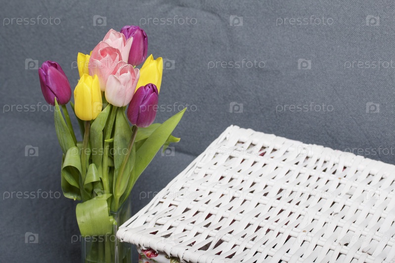 Букет тюльпанов разных цветов на сером фоне. Следующая плетеная коробочка