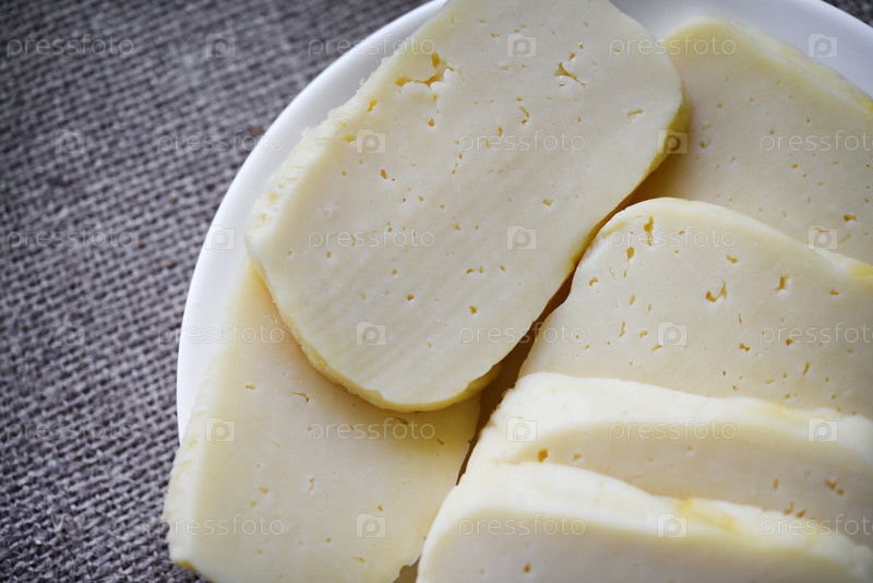 На тарелку нарезают ломтики сыра. Вкусный сыр с дырочками