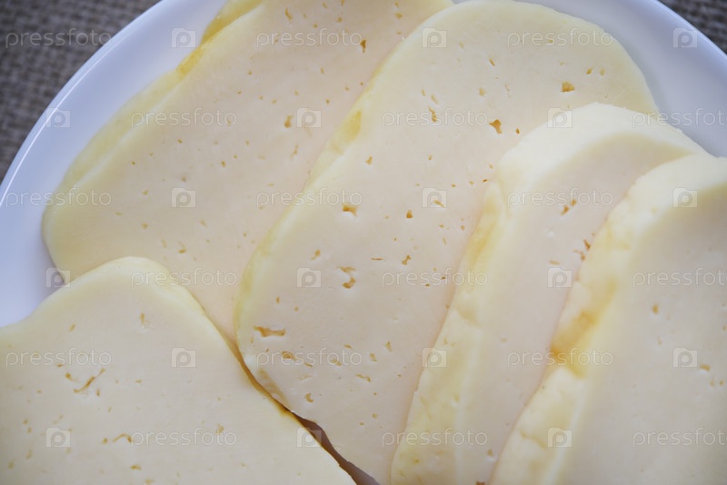 На тарелку нарезают ломтики сыра. Вкусный сыр с дырочками