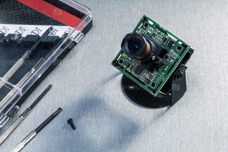 Концепция ремонта камер видеонаблюдения. современная камера видеонаблюдения и набор отверток на столе