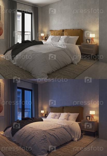 Интерьер спальни днем и ночью