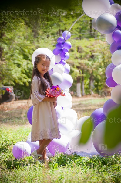 7-летняя азиатка позирует в платье среди зелени на фоне арки из воздушных шаров
