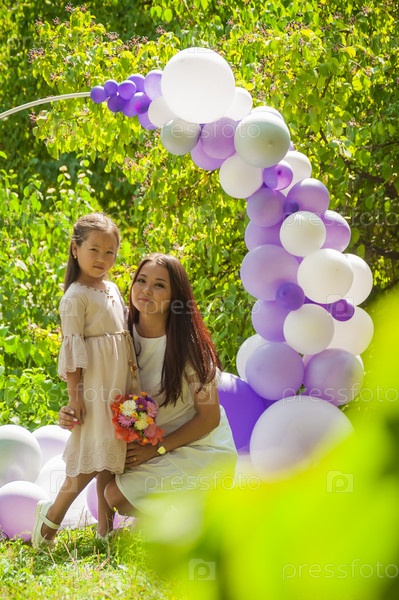 Мама и дочка 6 лет позируют на заднем плане, на природе среди зелени