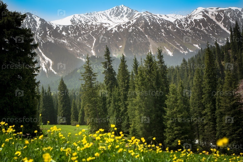 Поле желтых цветов в горах Кыргызстана