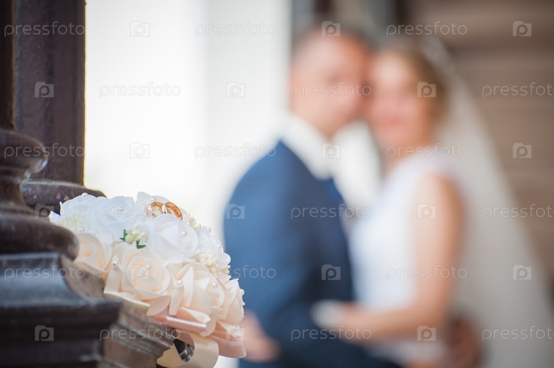 Свадебный букет невесты с обручальными кольцами крупным планом, фоновое изображение