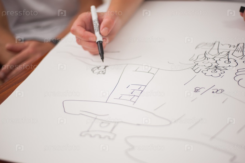 Рука держит фломастер, человек рисует картинку
