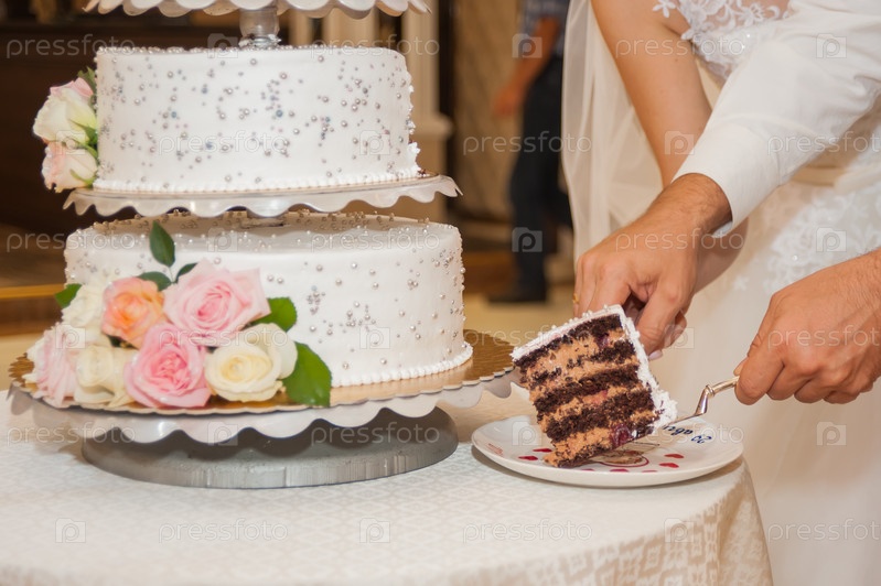 Жених и невеста разрезают свадебный торт