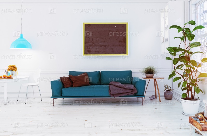 Современный скандинавский дизайн гостиной. 3D концептуальная иллюстрация