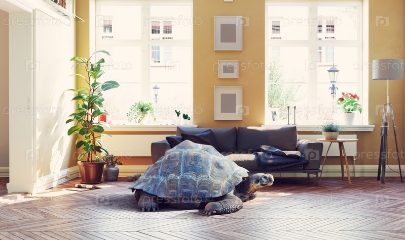 Гигантская черепаха в гостиной. Комбинация фотографий и медиа-креативной концепции