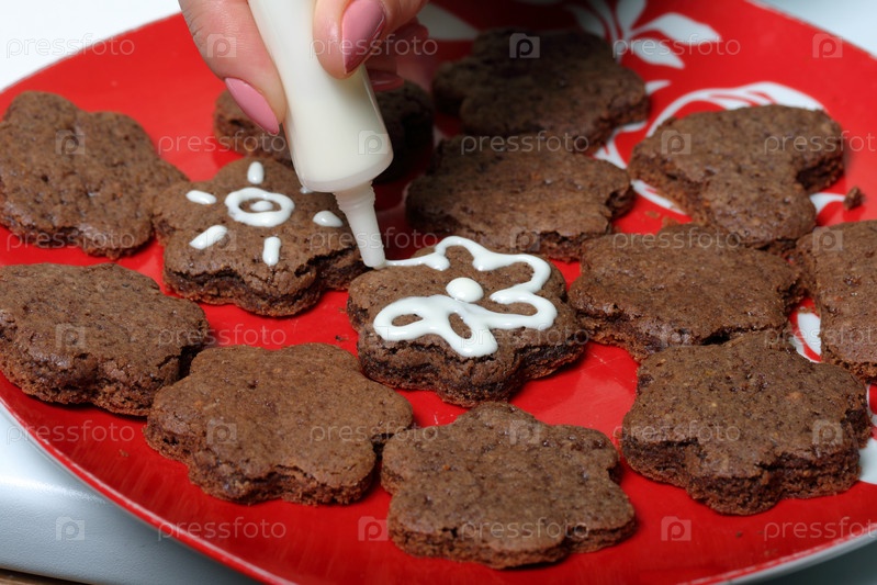 На тарелке лежат испеченные пряники. Женщина выдавливает глазурь из тюбика, украшая печенье. Некоторые украшены белой глазурью. Готовим пряники
