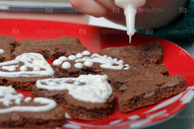 На тарелке лежат испеченные пряники. Женщина выдавливает глазурь из тюбика, украшая печенье. Некоторые украшены белой глазурью. Готовим пряники