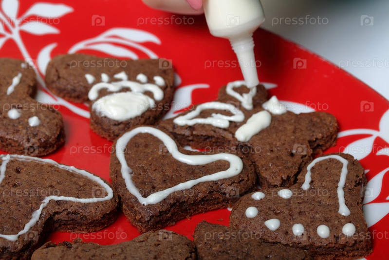 На тарелке лежат испеченные пряники. Женщина выдавливает глазурь из тюбика, украшая печенье. Некоторые украшены белой глазурью. Готовим пряники