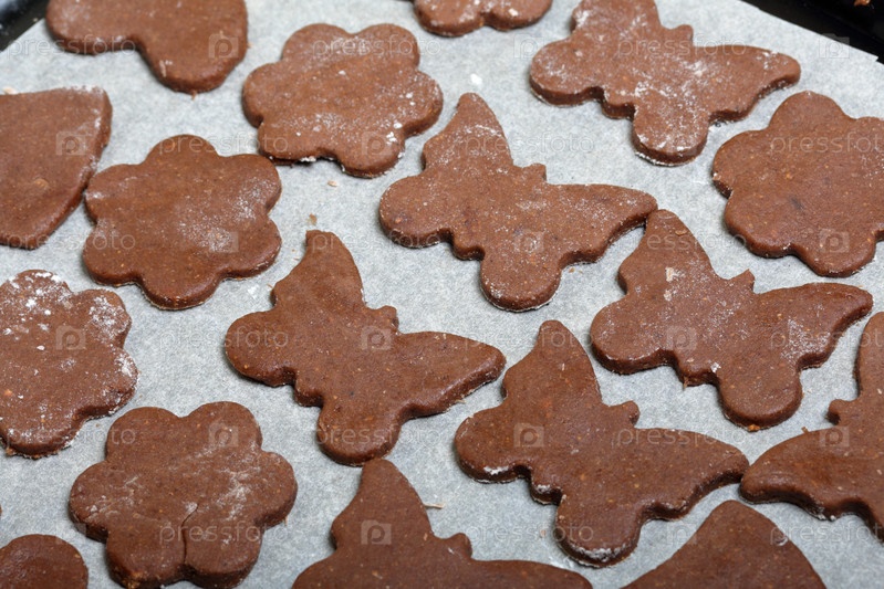 На противень выкладываем заготовки для выпечки пряников. Они на пищевой бумаге. Готовим пряники